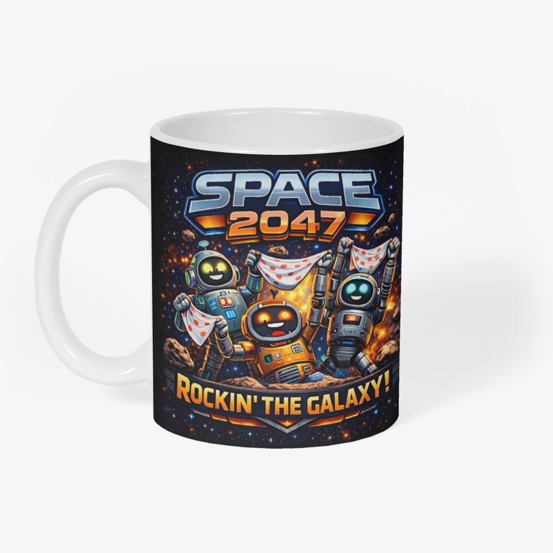 A mug featuring a 3 robots mug design, that features three robots holding pairs of underpants. Robots waving underpants feature in my book Space 2047, which is about a group of space delivery drivers. You can buy the mug via the button below: Click here to buy the 3 robots mug Post navigation Space 2047 rockin the galaxy mug Space 2047 rockin the galaxy Robot T-shirt